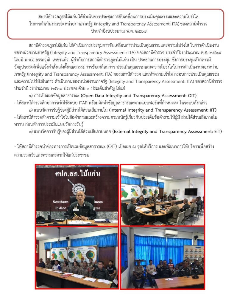 พ.ต.อ.อรรถวุฒิ  เพชรแก้ว ผกก.สภ.ไม้แก่น พร้อมข้าราชการตำรวจสภ.ไม้แก่น ทุกแผนกงาน ร่วมประชุม ติดตามการประเมินคุณธรรมและความโปร่งใสในการดำเนินงานของหน่วยงานภาครัฐ (Integrity and Transparency Assessment: ITA) ของสถานีตำรวจประจำปีงบประมาณ พ.ศ. ๒๕๖๘ ครั้งที่ ๑ เน้นย้ำการเปิดเผยข้อมูลสาธารณะ (Open Data Integrity and Transparency Assessment: OIT) ลงในเว็ปไซต์