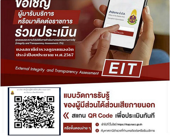 ขอเชิญประชาชน ร่วมทำแบบวัดการรับรู้ของผู้มีส่วนได้ส่วนเสียภายนอก External integrity and transparency Assessment (EIT) การประเมินคุณธรรมและความโปร่งใสในการดำเนินงานของสถานีตำรวจ ประจำปีงบประมาณ 2568 สำหรับประเมิน สภ.ไม้แก่น จ.ปัตตานี